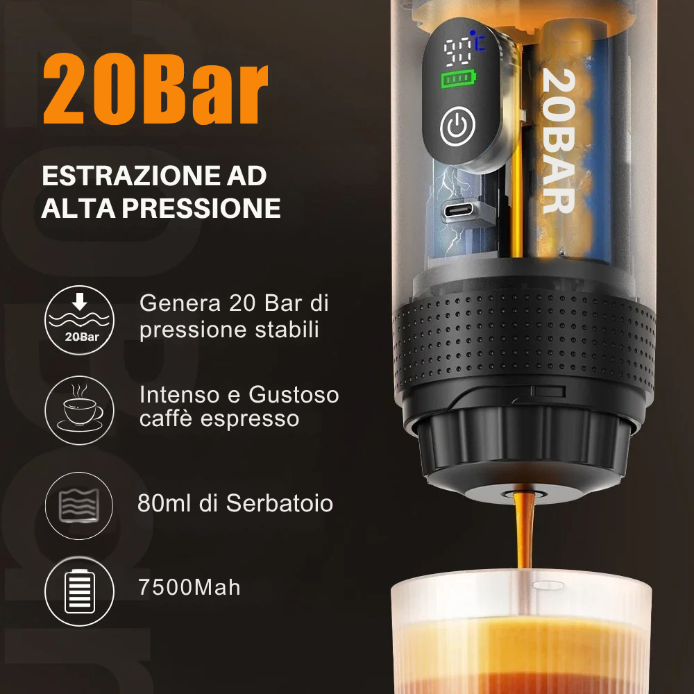 MokaElite con la sua seconda generazione aumenta il serbatoio a 80 ml, genera una pressione di 20 BAR costanti e una batteria più duratura da 7500Mah. Inoltre con il display digitale è possibile controllare lo stato di carica della batteria.
